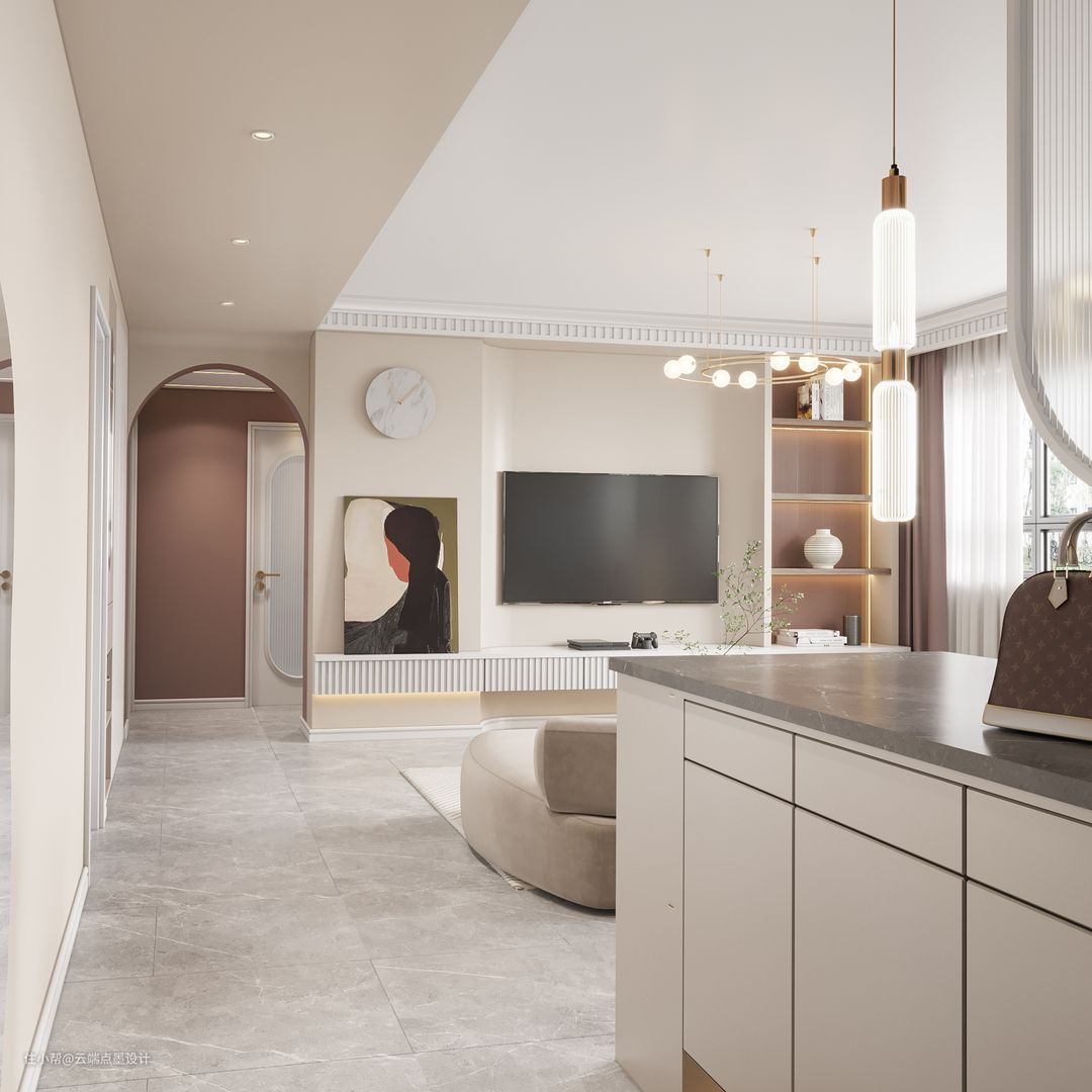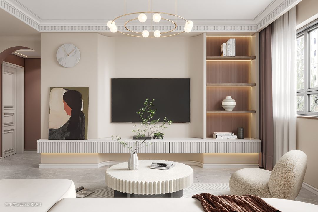顶面的吊顶造型和与家具造型相互呼应,弧形“圆素”的应用也让空间更具美感。