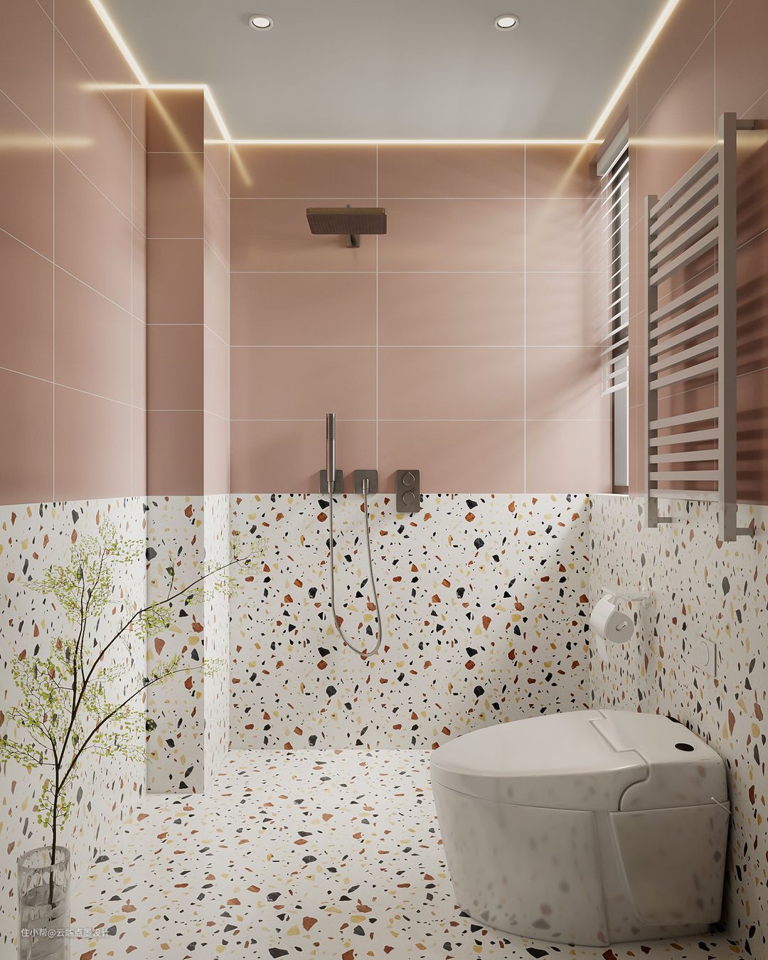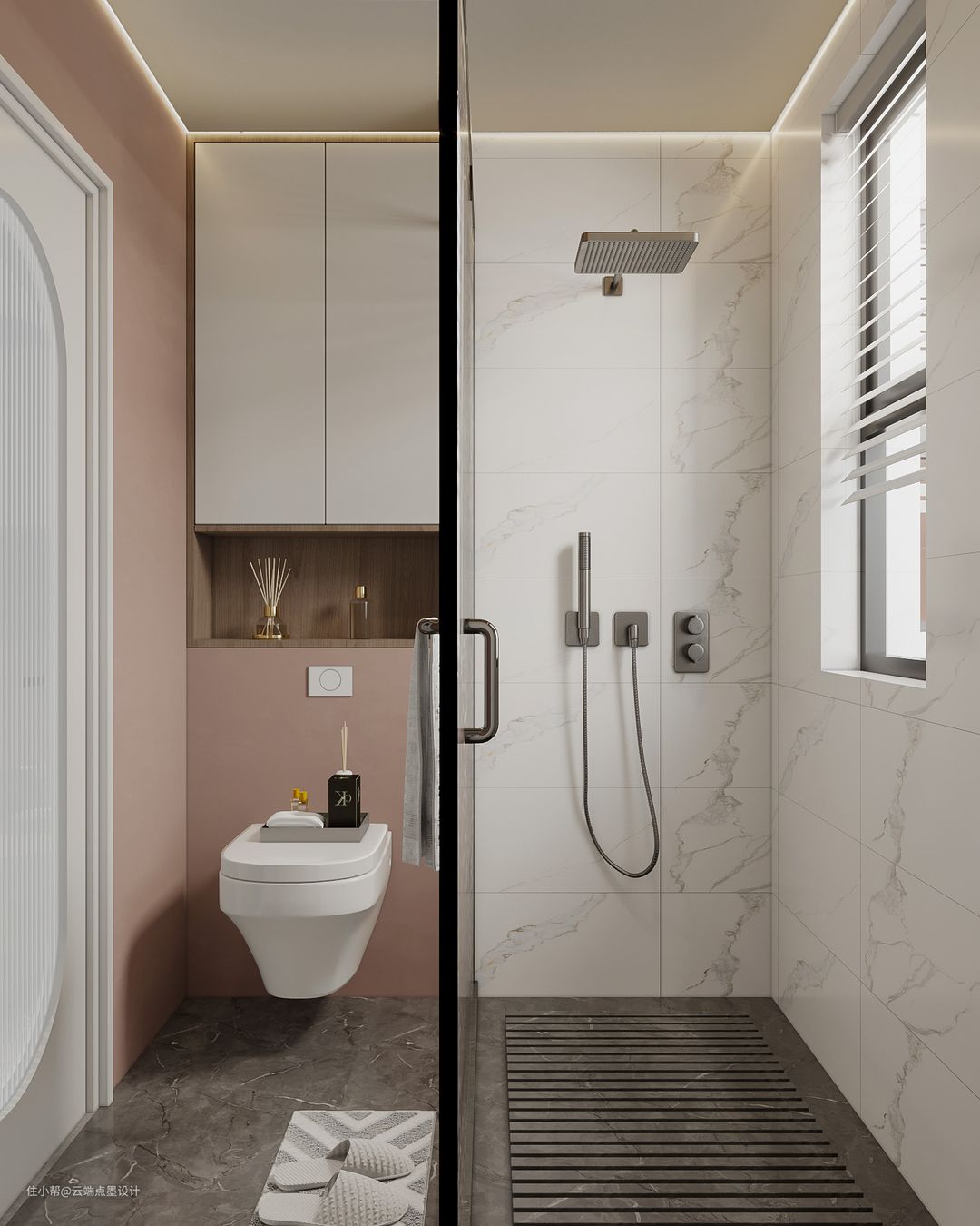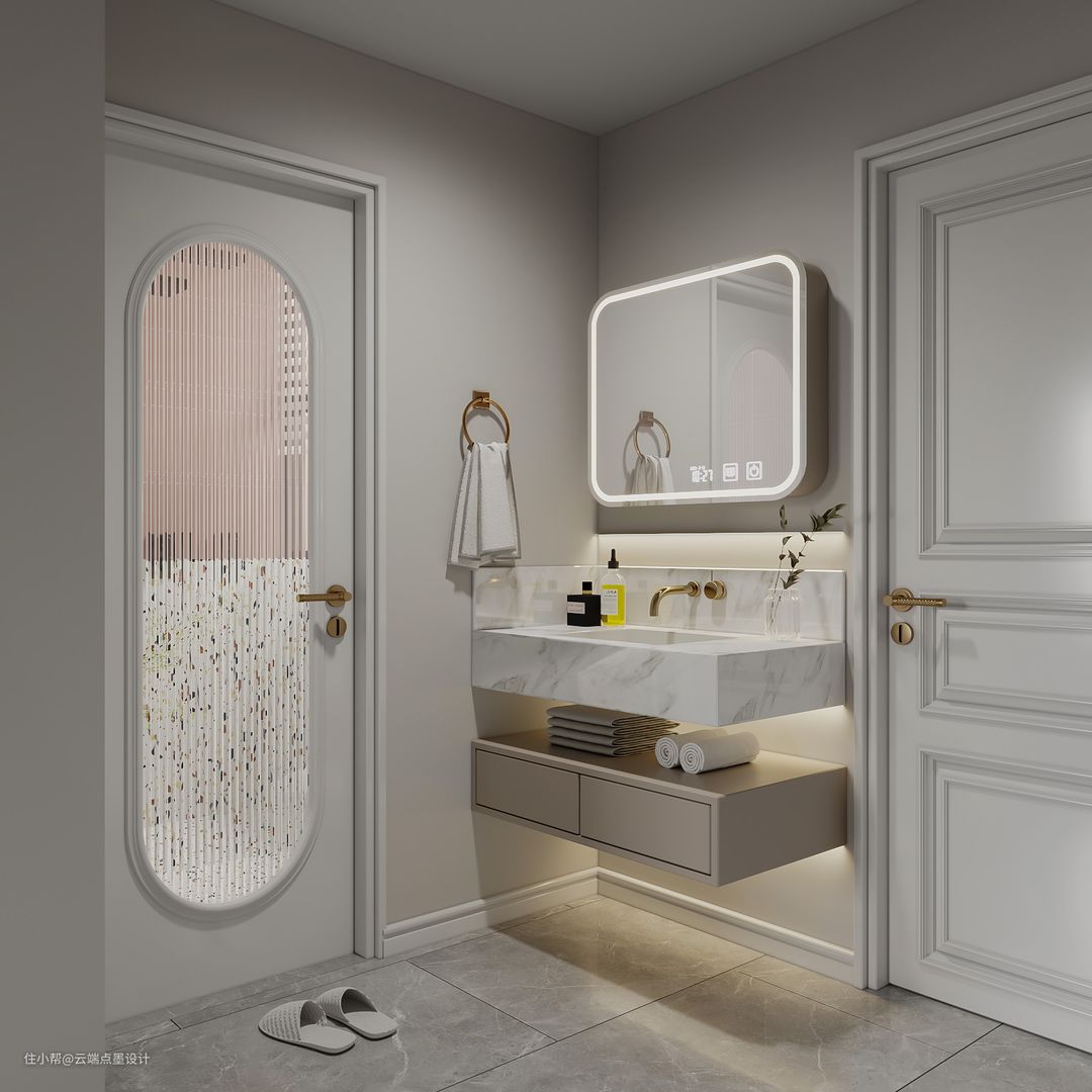 卫浴空间划分为干湿两大区域,大理石地砖搭配白色浴柜,营造出简洁温柔的空间效果。