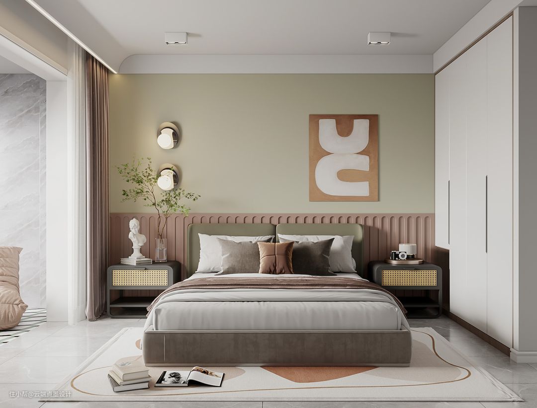 清新的绿色犹如一缕轻风,为空间带来更多生机与活力。地面铺上一块奶咖色与奶油色相结合的地毯,简致细腻。