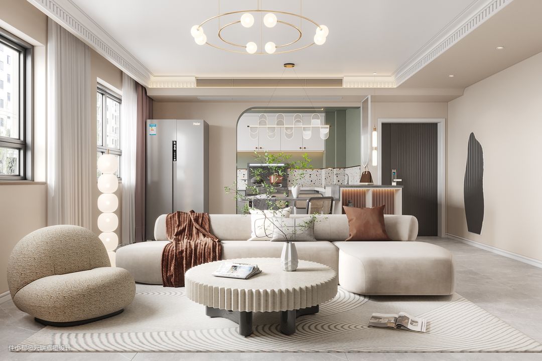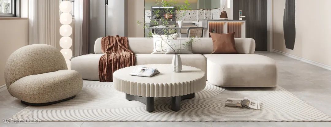 本案设计师将奶咖底色搭配暖白色家具,奠定了全屋温暖治愈的基调,高级又显气质的奶油色融入整个家居之中,营造出了软软糯糯的视觉效果。