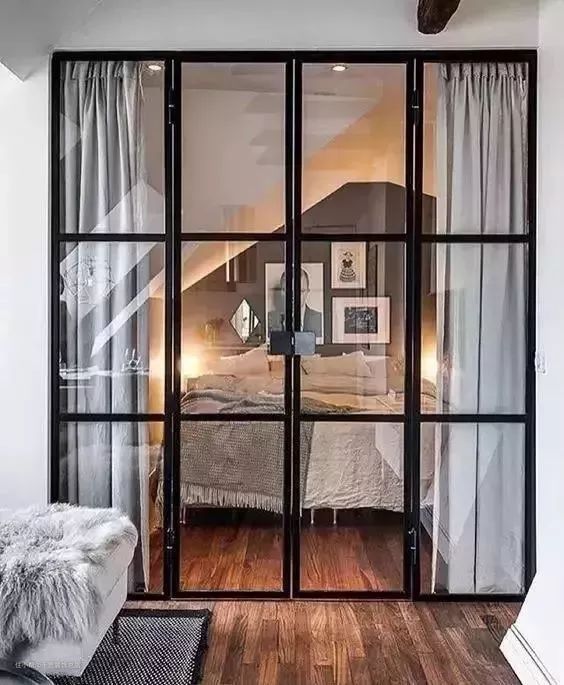 卧室也可以设置玻璃门,看各家的接受程度了,担心隐私的话,可以安装磨砂类的玻璃门,或者干脆再安装一个帘子,既通透又保护隐私哦!