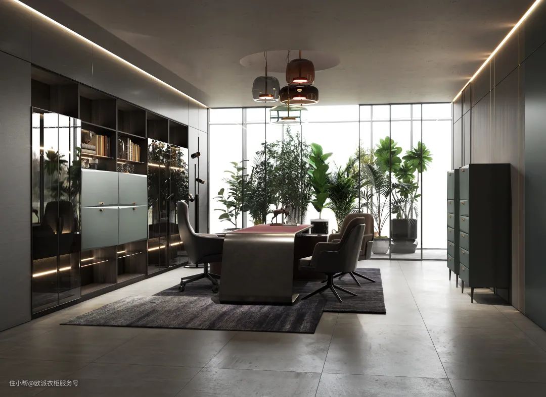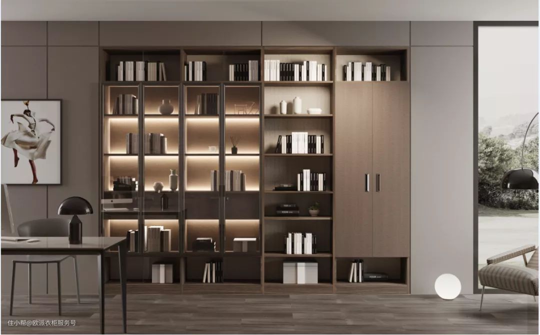 设计亮点:书柜选用铝框玻璃门,规整有序,通透明亮,能更直观的看到书柜内的收纳物品,同时采用几何造型门板,通过柜门斜面、斜角等自由几何造型,整体效果富有立体感和层次感,符合理科老师气质。