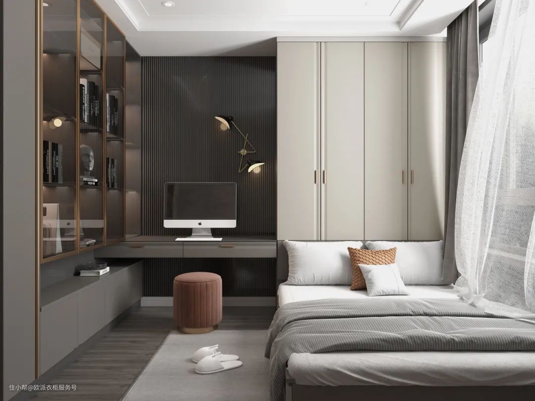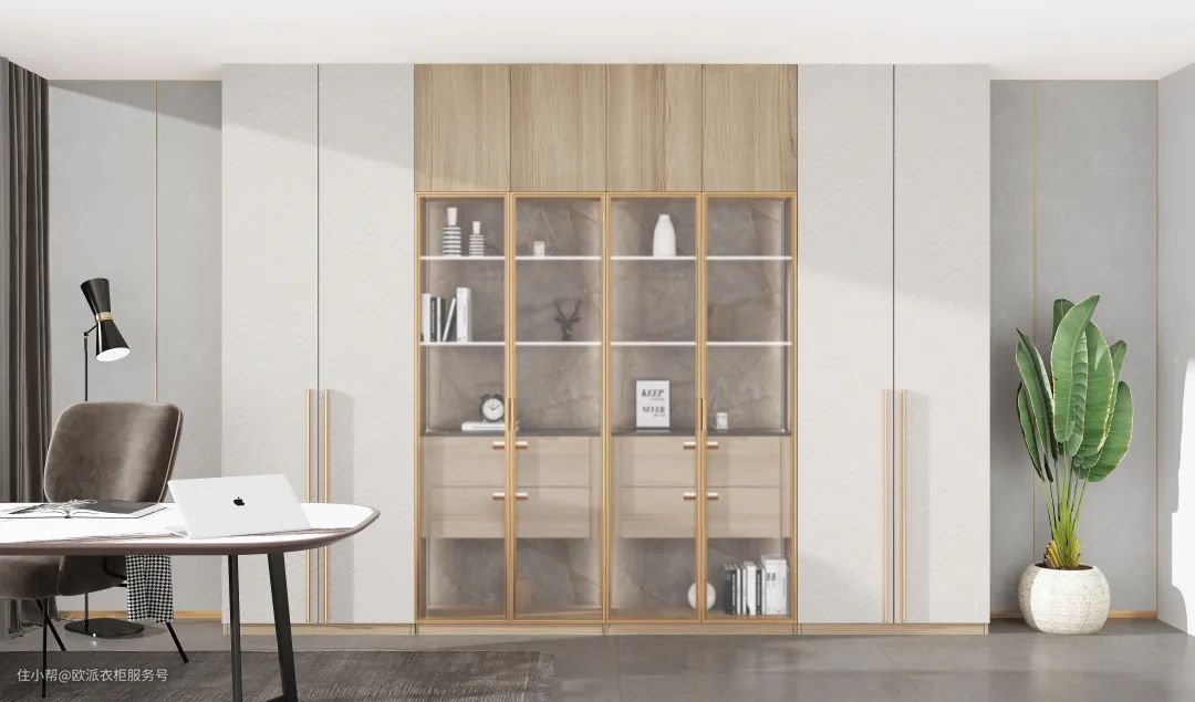 设计亮点:文综老师的有趣灵魂大多寄于书籍,书柜对称设计,一门到顶丰富收纳空间,收藏更多乐趣。拉手选用典雅白金配色,搭配几何切割线条,犹如书中自有黄金屋。