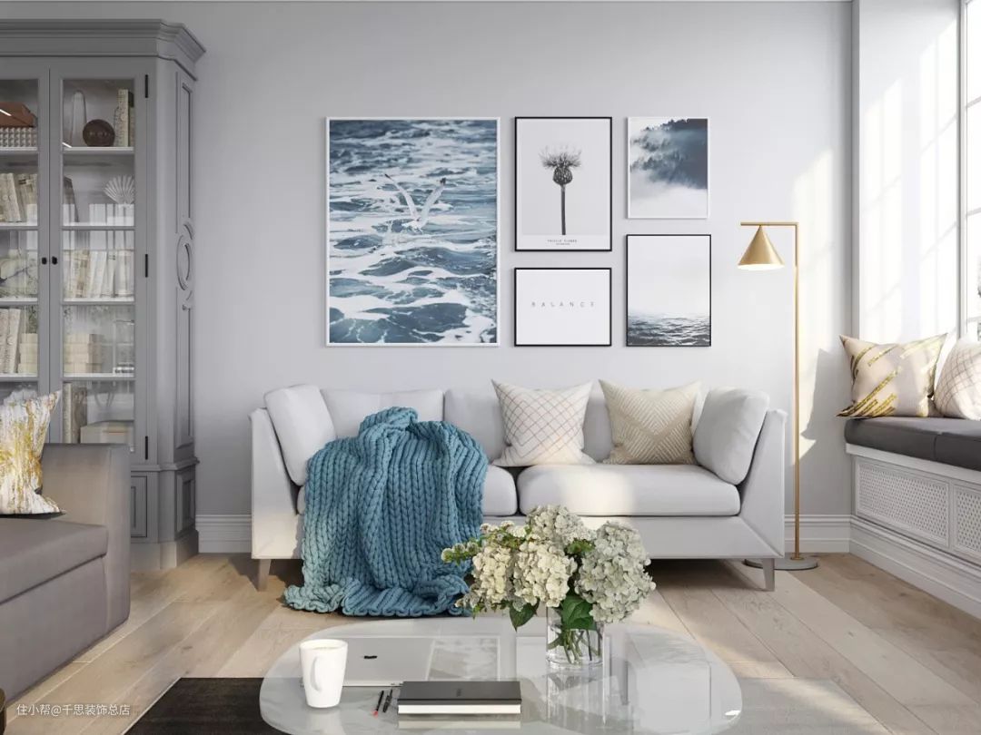 挂画与沙发的留白距离控制在15-20cm之间;墙面与天花板距离要>20cm,按照这个布局的距离基本上不出错。