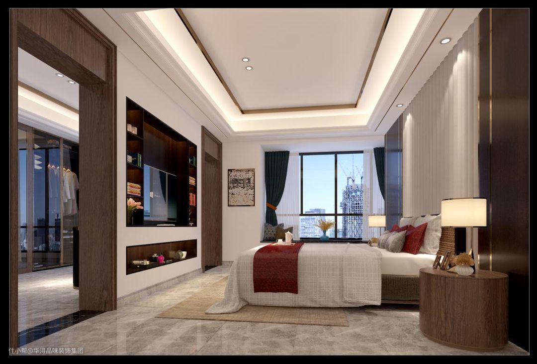 门和床头柜都选择带有木材纹理的材质,木材纹理更接近于自然,在心理上比金属和石材都更能让人放松。在床品上选用红色的床旗和抱枕作为点缀,营造出一种新婚的喜庆氛围。