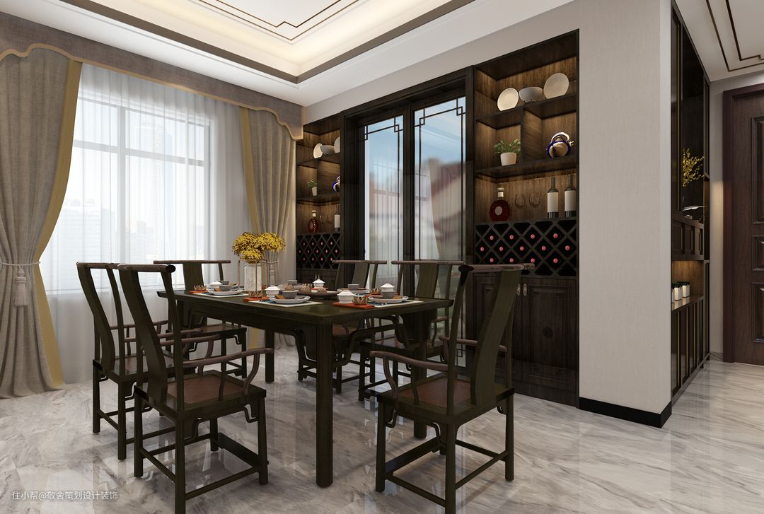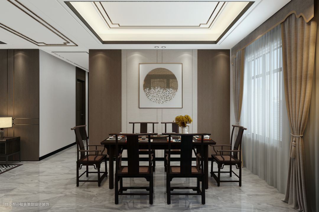 餐厅摒弃繁冗复杂的装饰,融入了东方的沉稳大气,胡桃木桌椅尽显高级感。墙面硬包作为一种现代大方的装饰元素,它能使得空间的质感更加华丽端庄自然,同时它也是一种非常和谐自然的设计质感,金属质感墙画使得空间的档次感更加端庄。墙面木质收纳,展示主人品味,干净利落的线条勾勒出古雅之意。