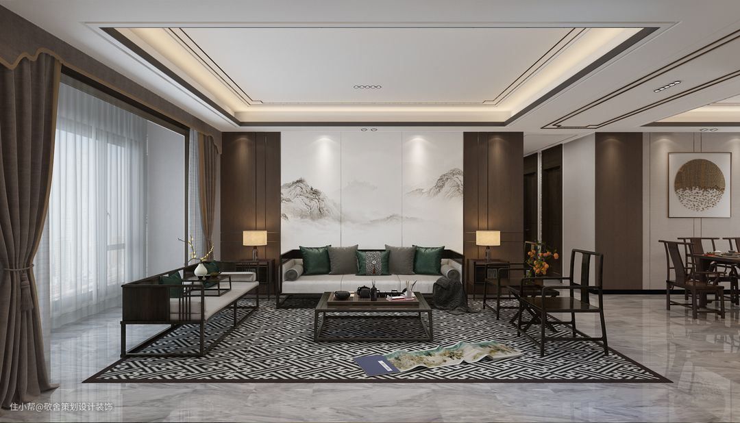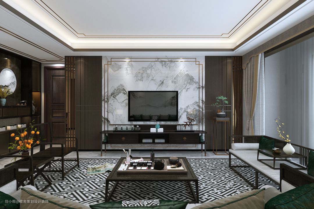 大气的实木沙发,木纹顺畅美观,细腿家具减少了家具的视觉阻碍,感觉整体的采光都变的敞亮了。墨绿色作为空间点缀色,沉稳而又不失高级感。空间的布局上更注重互动性,围合式的客厅布局、开放式的客餐厅,都能增进彼此之间感情的交流。素雅的布艺和简约大气的水墨硬包背景墙和谐共融,古典中不乏大气。