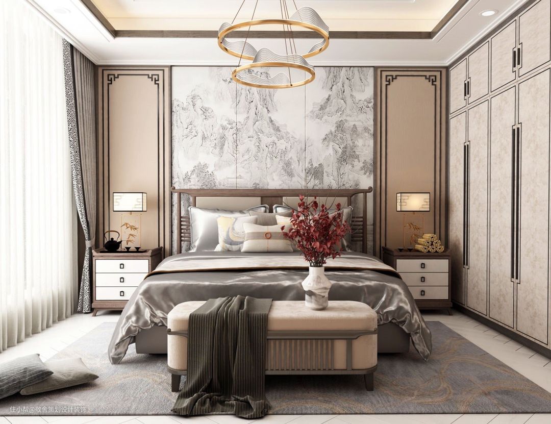 卧室风格沿用整体的中式风格,整体色调创造出柔和宁静的气氛,整个空间的中式元素装饰,恰到好处。落地窗采光明亮,嵌入式衣柜节省了许多空间,视觉效果十分宽阔大气。