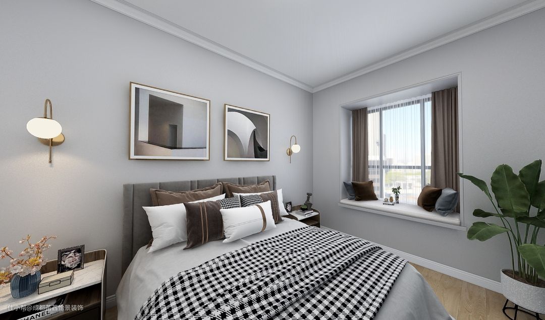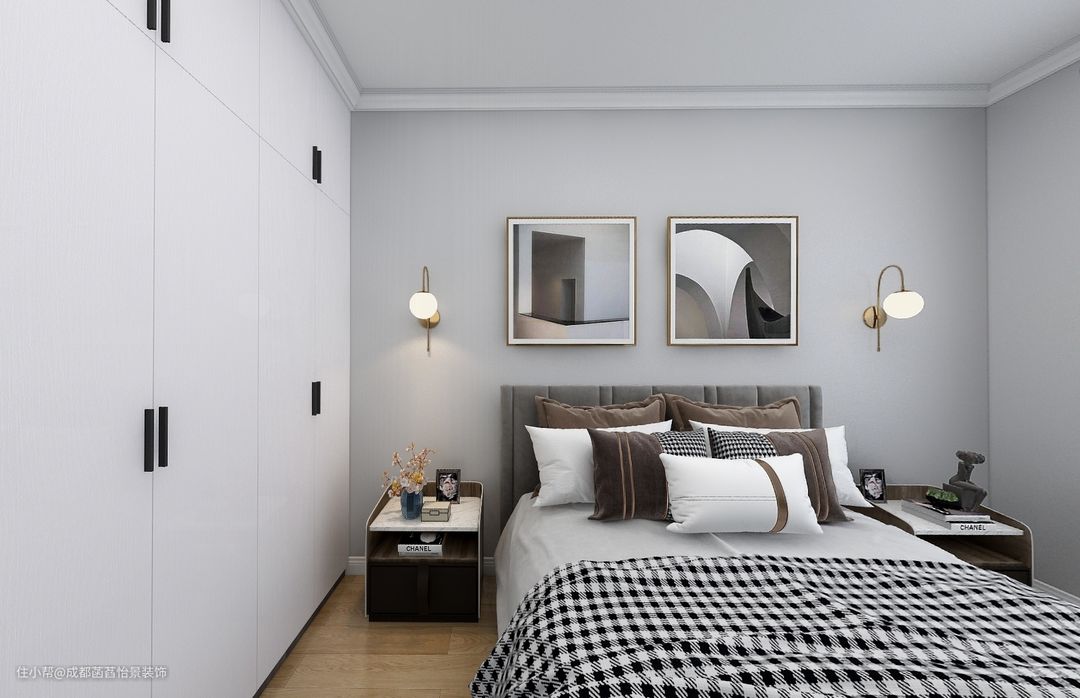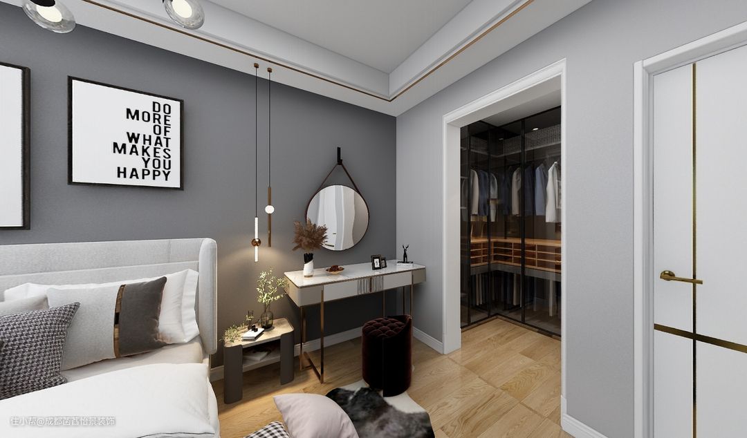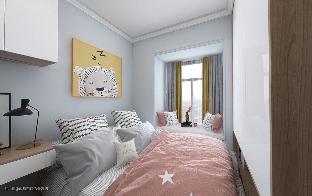 次卧也是温暖的米+灰色调,因为这里主要当做父母房使用,并不常住人,便主要以补充储物+睡眠为主要功能,不设过多装饰,墙面也大面积留白,给未来根据需求重新布置,留足了空间。
