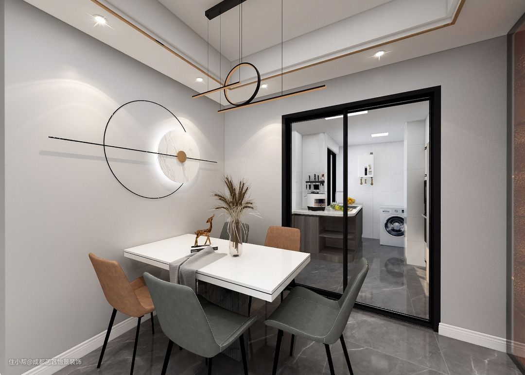 两色搭配的座椅和餐桌的大理石台面,搭配灰色瓷砖与纯色的背景墙,在餐厅灯光的映衬下,显得格外精致。