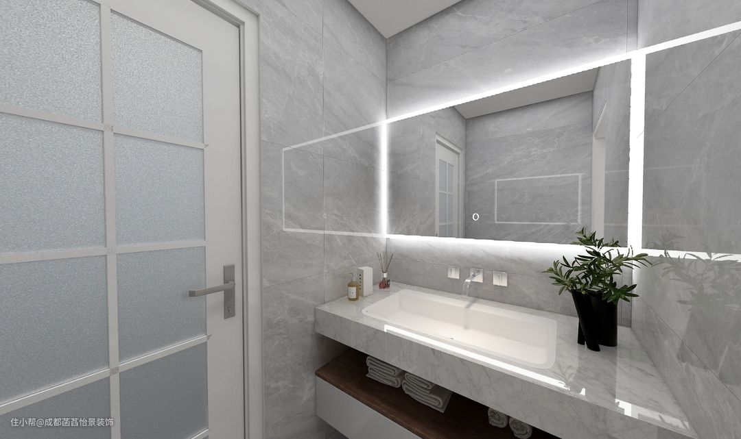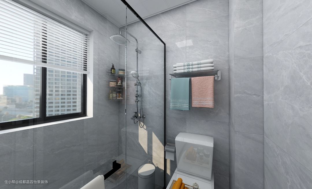 卫生间面积不大,黑色玻璃隔断形成独立半开放式淋浴区,同时干湿分离更有利于日常清洁,半开放式浴室柜装饰性强又具有收纳功能。