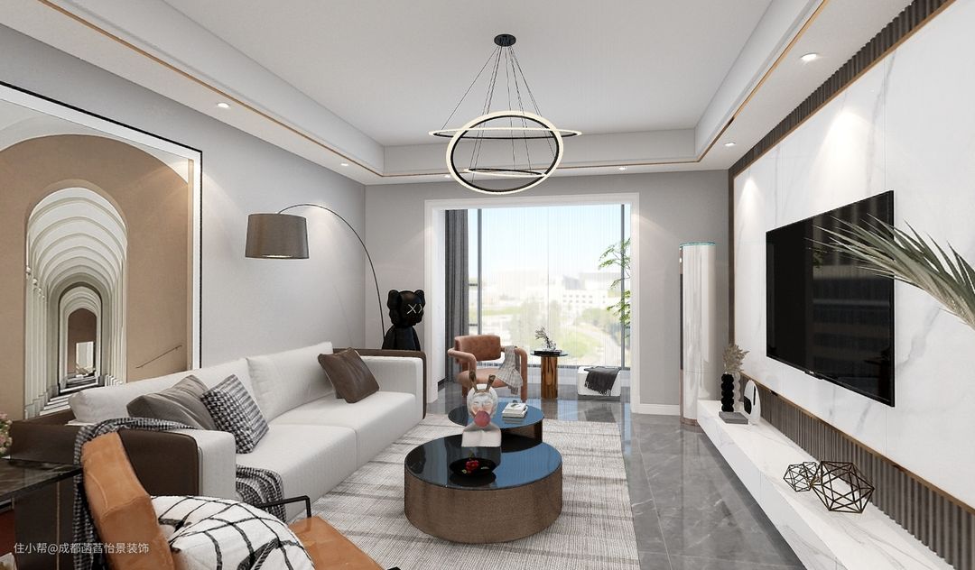 客厅区域,整个空间采用白+灰+棕为主色调,塑造出典雅大气的质感。