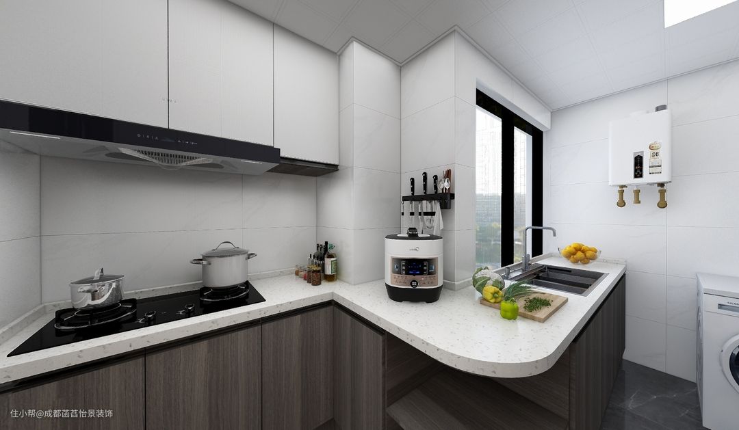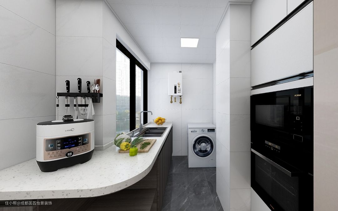 厨房燃气灶和水槽布置在两侧墙体,规划出合理的操作空间。除了操作台位置的吊柜和下柜外,对面也定制了整面墙的储物柜,冰箱、烤箱、蒸箱等大型厨电皆能嵌入其中,视觉上显得极其利落。