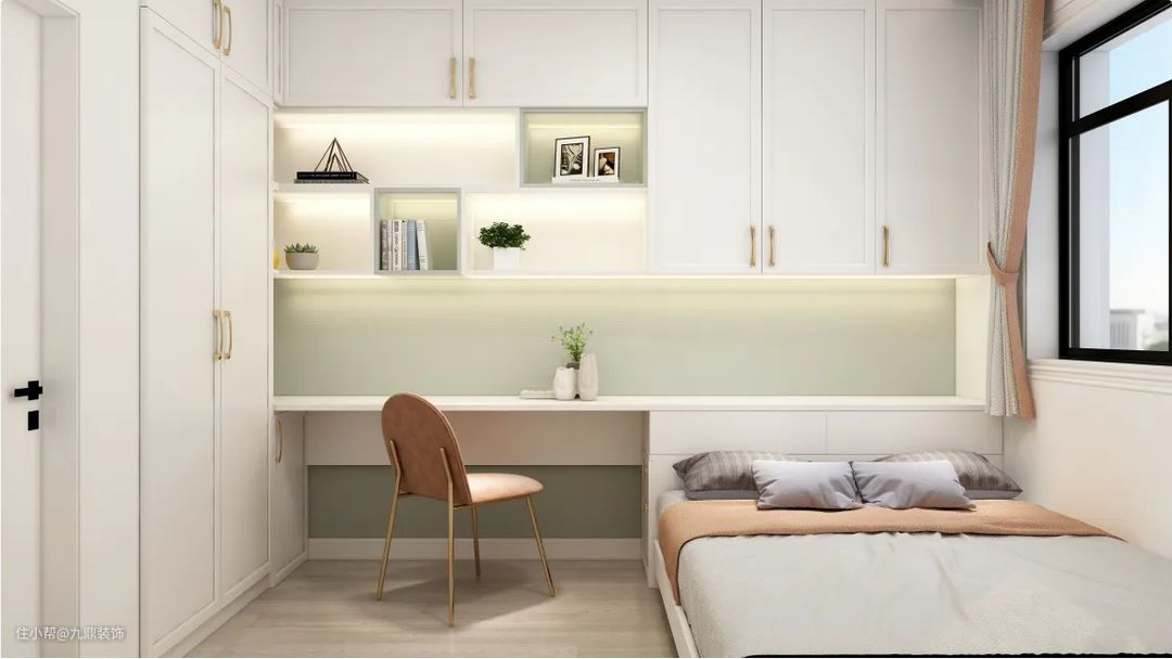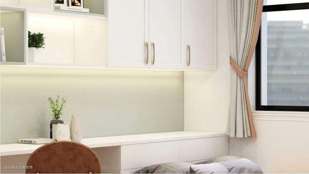 考虑到小朋友从小到大的物品较多,所以儿童房的收纳设计更是费了一番功夫。由于孩子成长过程中衣物时常更换,所以衣柜用两扇到顶的衣柜,平常做好断舍离,就足够放孩子的衣物。当然,柜子从来都不会嫌多,所以床头的吊柜作为备用的收纳空间。