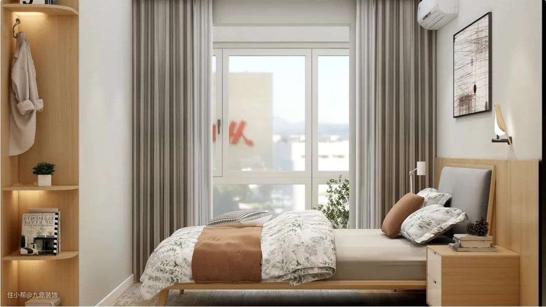 次卧用半高的木板做背景墙来呼应日式主题。由于主卧的衣柜借用了次卧的空间,为了弥补次卧的收纳需求,进门拐角处做了一个转角柜,方便放杂物。