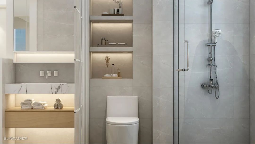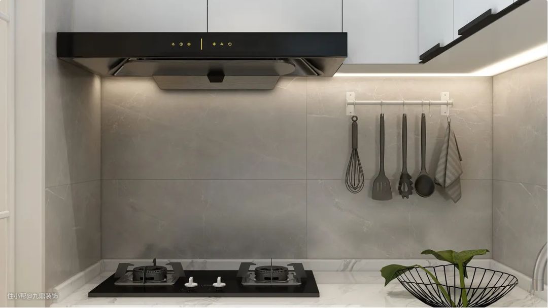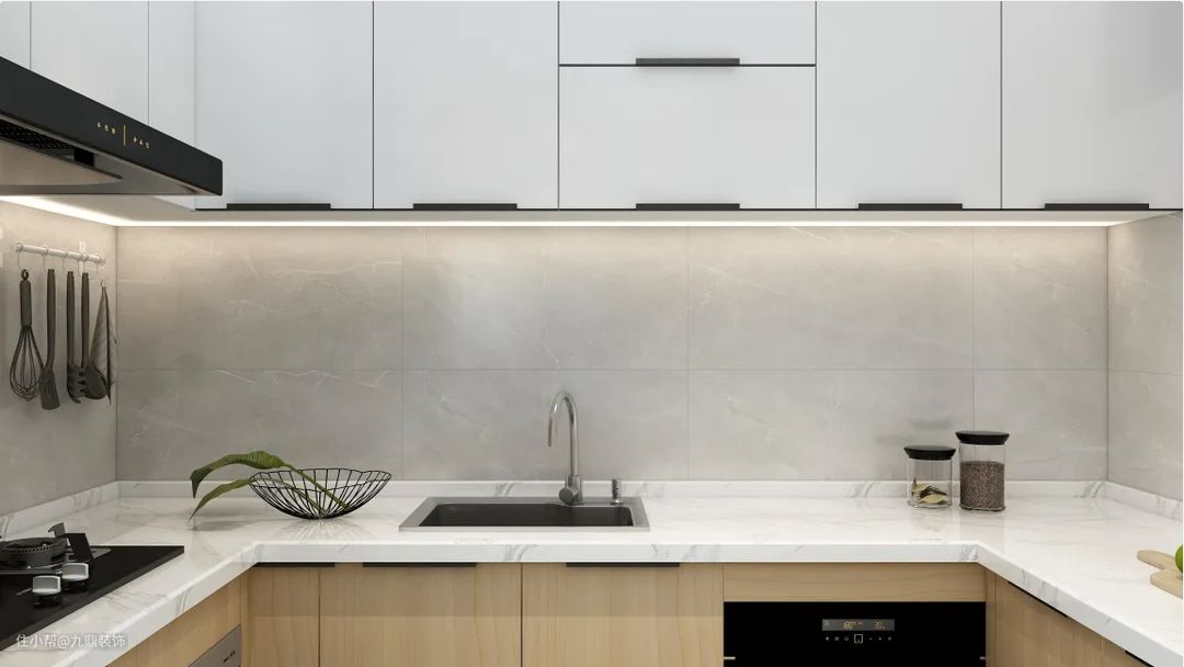 该户型的厨房比较小,所以选择了空间利用率更大的U型台面设计。地柜加吊柜的组合极大程度上增加了收纳空间。厨房虽小,但动线更短,烹饪更方便。