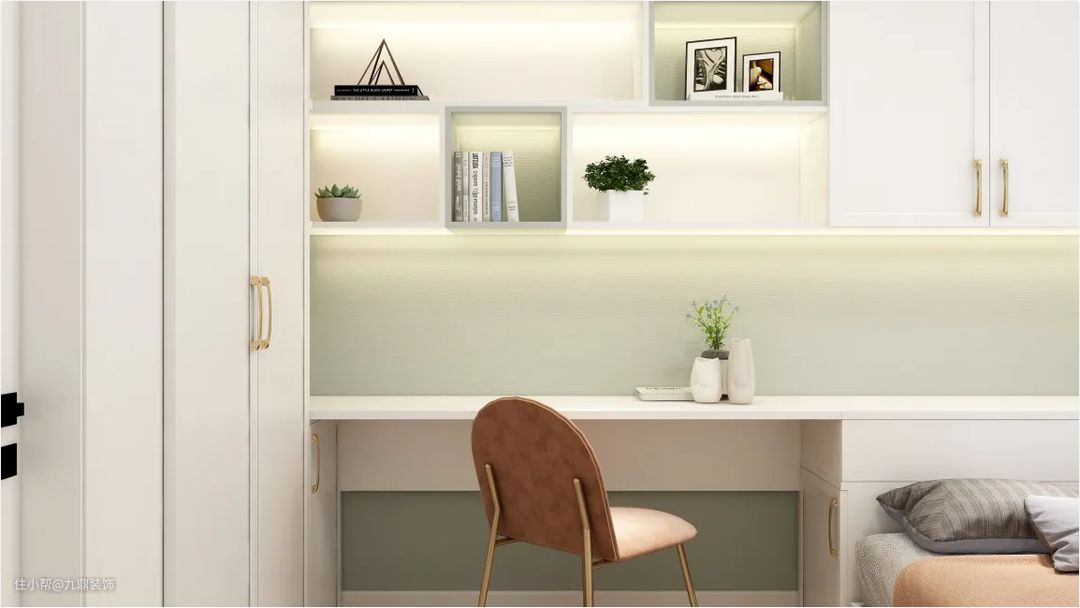 利用墙面空间打隔层木板作为学习放书的书架。书桌底下的空间也不放过,侧面两边的暗柜,可以放不常用的物品或是有儿时回忆的玩具。