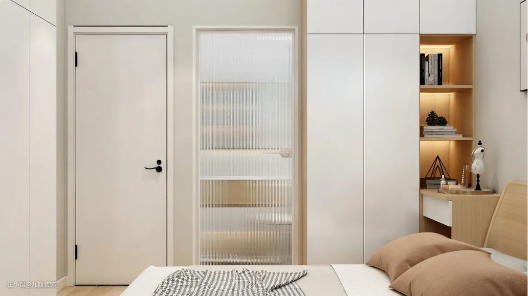 主卫门旁边的空间也要利用起来,于是定制了小型的衣柜,方便收纳。主卧的收纳必然不仅仅是门边两个衣柜,床尾的空间也是充分利用了起来,整排的大衣柜满足两个人一年四季的衣物存放。