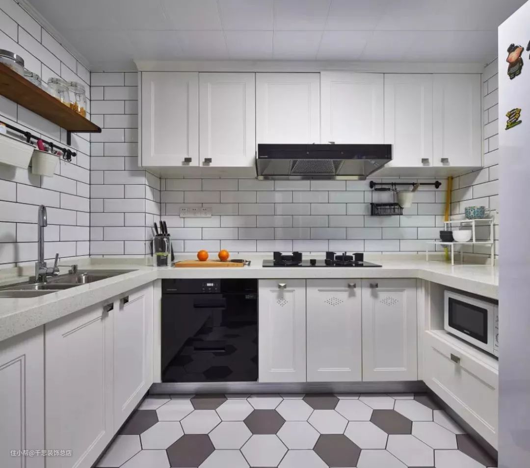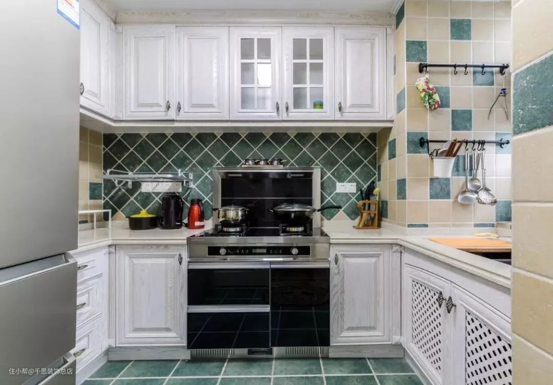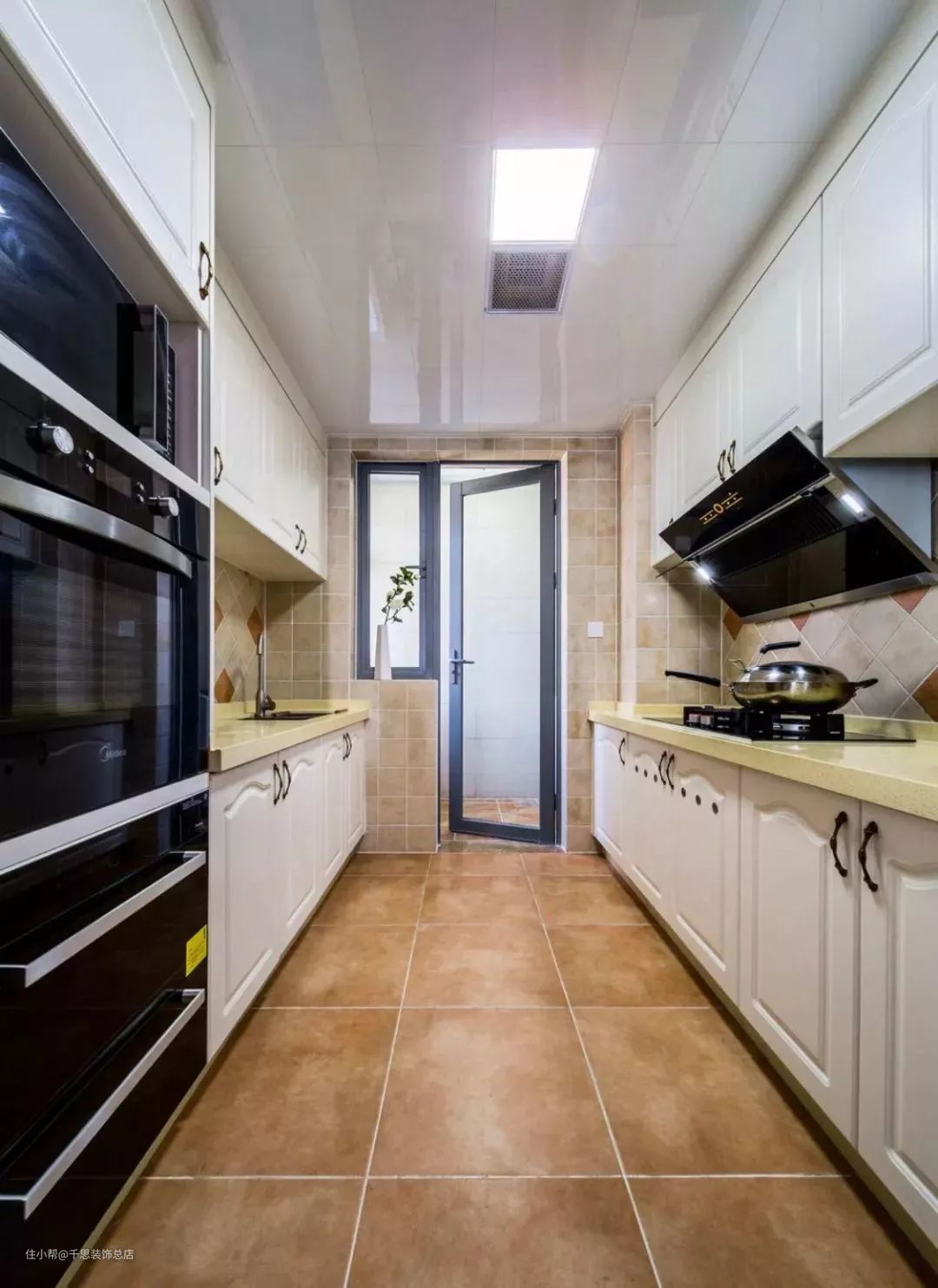 在一些比较欧美式的厨房,白色橱柜门带上纹理的话,结合仿古砖的搭配,整个空间会显得更加优雅大方。