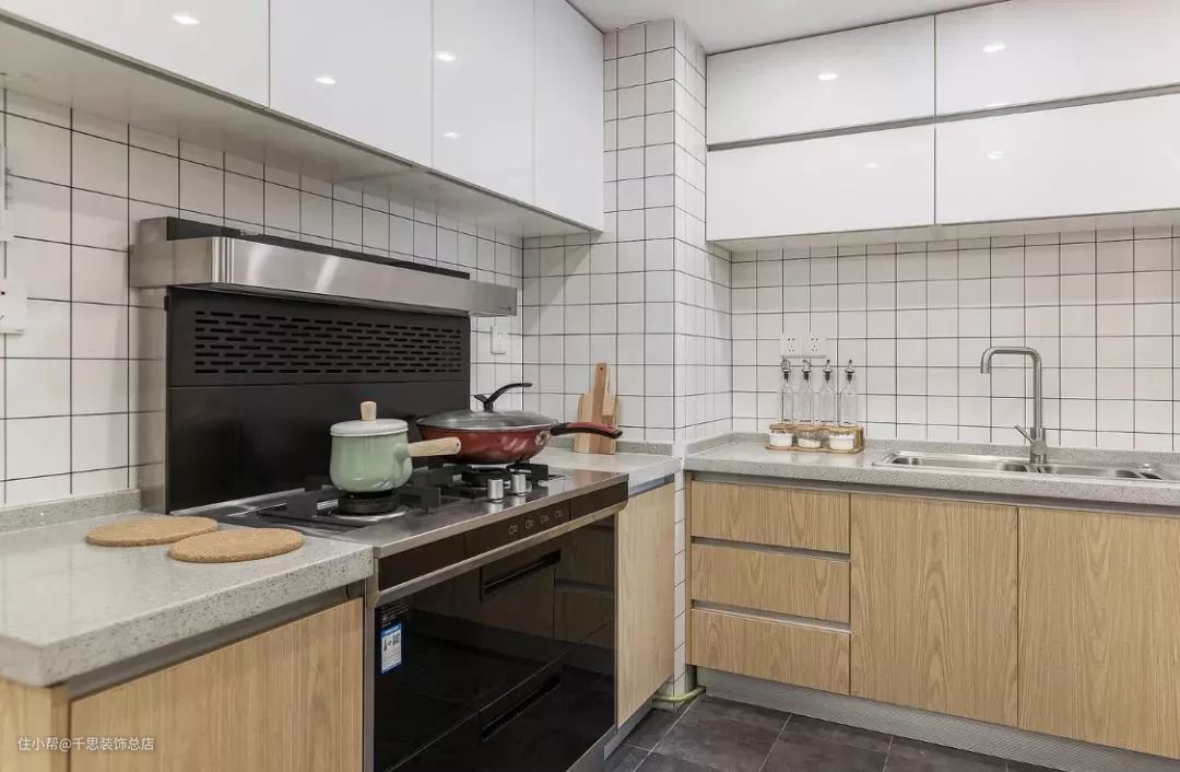 在北欧、极简、原木等风格中,采用原木质感的橱柜门板,搭配白色的墙砖,整个厨房也会显得非常的舒适自然,做饭的空间都好惬意自在。