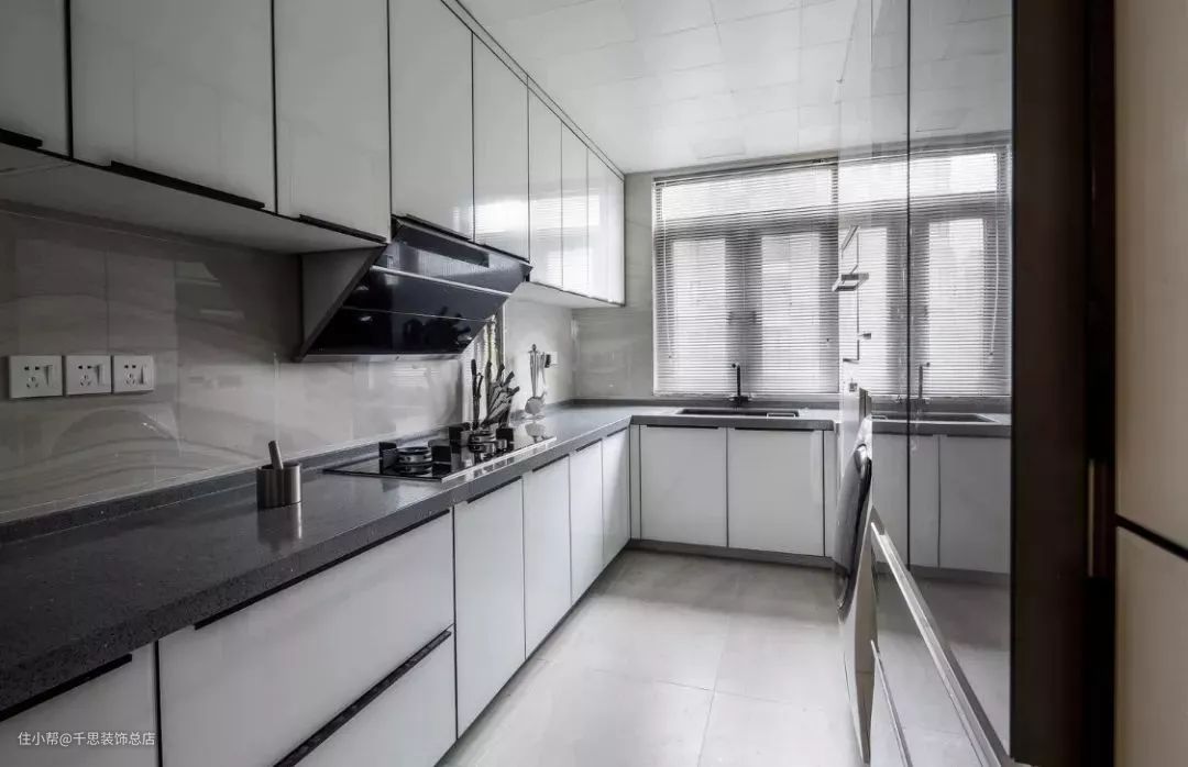 除了亚克力板,对于简约现代风格的厨房,选择白色的普通板材,搭配上灰调或黑色,整体空间效果也是非常的简约自然。