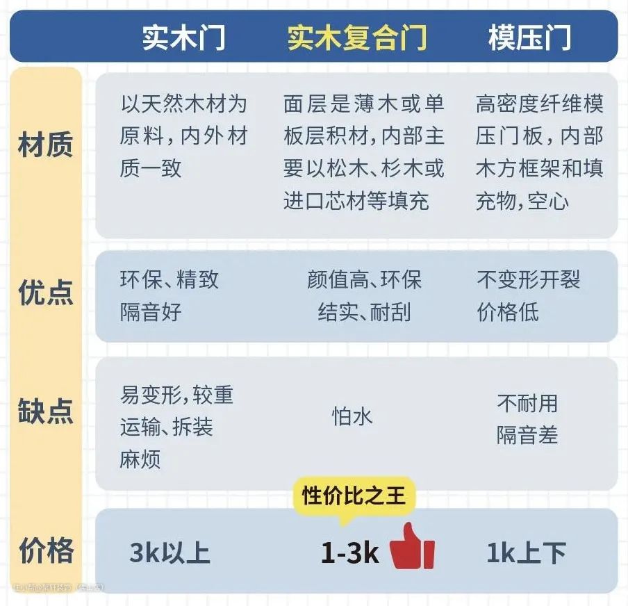 不同种类的木门由于材质的差异,优缺点不一,价格区别也很大(对比见下图↓↓)