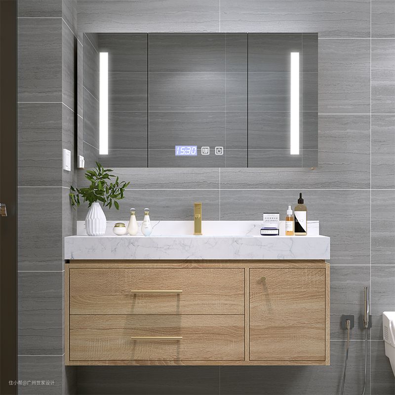 3.作为智能镜柜,触屏功能自然是少不了的,镜面内置了触摸屏。一键就可开启镜面除雾功能,镜面自带的环绕灯带也是由此触控板操控的。360°镜面环绕的LED灯照明,夜间即使不开卫生间的主灯,也可照亮浴室柜周围,方便洗漱。而且LED灯还有白光、自然光、暖光三种灯光可以调节,对于需要梳妆打扮和整理仪容的上班族来说,一面镜子就可以搞定很多事,节省了很多时间。