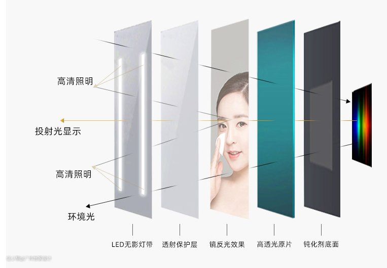 1.首先,智能镜柜的镜面以玻璃为原片,经过抛光、镀银、耐磨蚀淋漆、防水加硬淋漆等多道工序加工而成,散雾快、耐压化,镜面反射率达到99%以上,成像会比普通镜柜清晰很多倍,脸上一点小小的污垢或者瑕疵都会照得很清楚。
