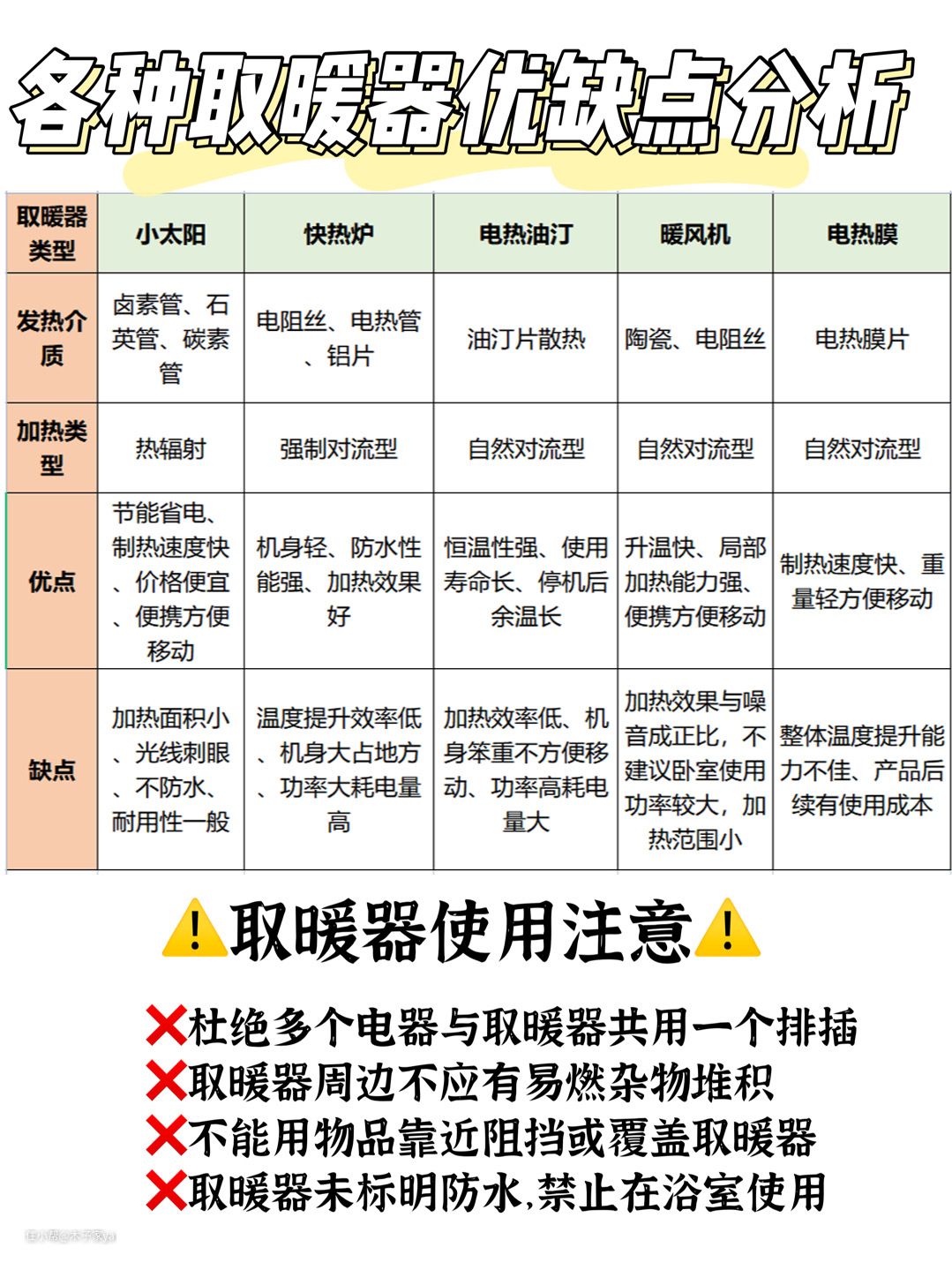 小太阳、快热炉、电热油汀、暖风机、电热膜优缺点请见上图
