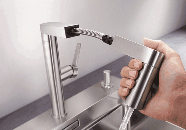 2、抽拉式水龙头:水龙头可以抽拉出来,冲洗台面、冲洗锅具超方便。