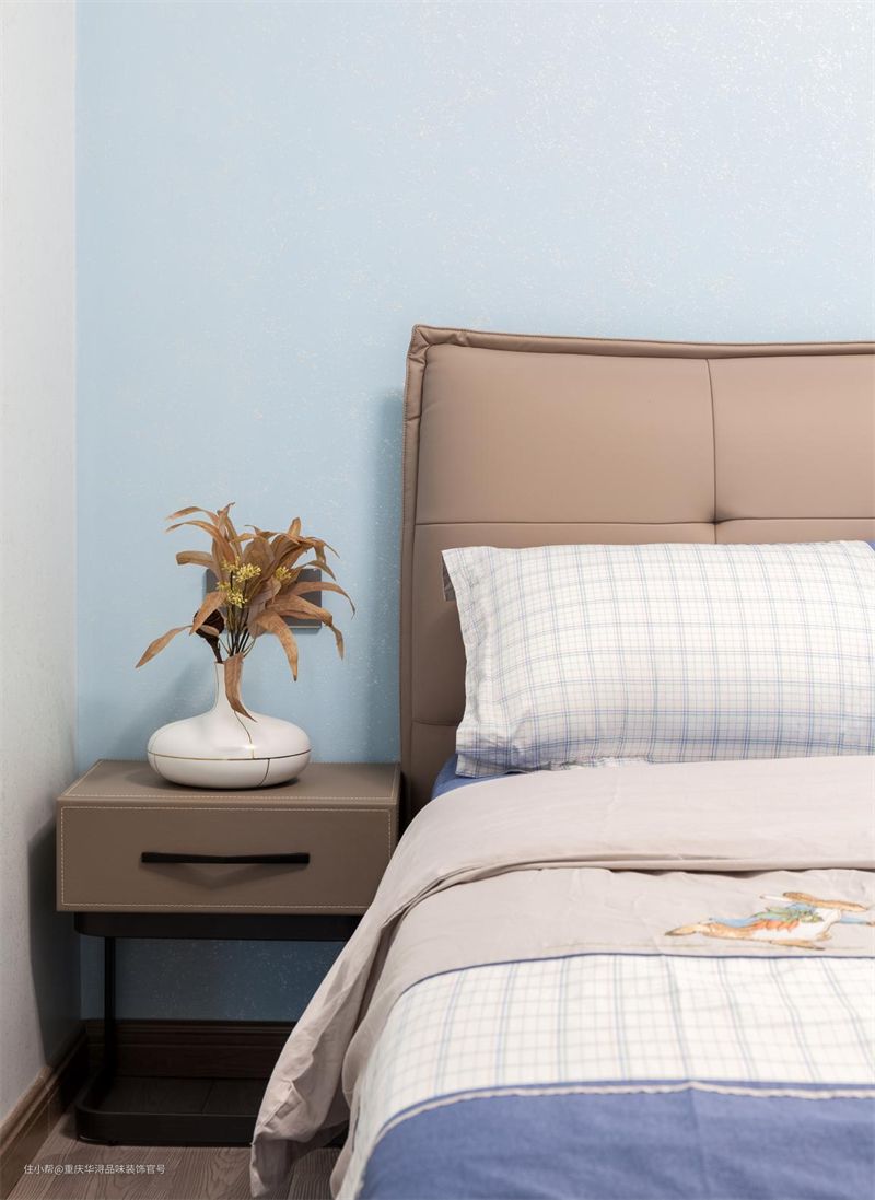 给我一张床,我将宅出整个世界。温馨高级的卧室,确实能让人有种赖着冲动,整体色调采用暖中性系,定制棕色床头柜,小巧又不失精致,简单搭配植物装饰,还要什么自行车!天蓝色棉麻网格四件套亲肤又柔软,夜夜好梦到天亮。