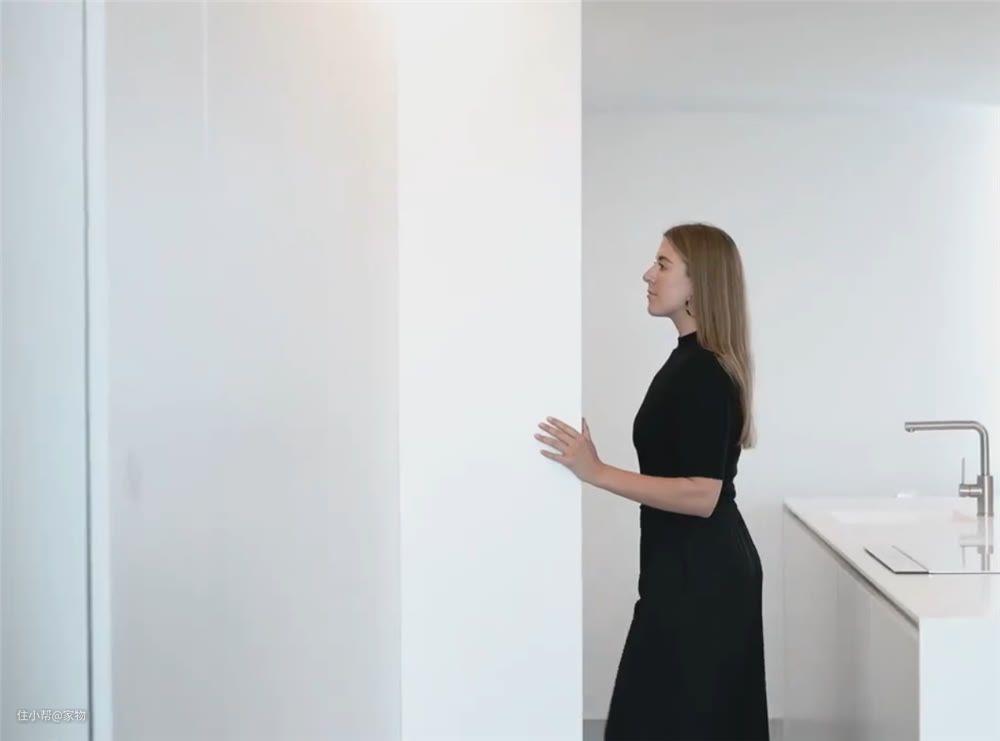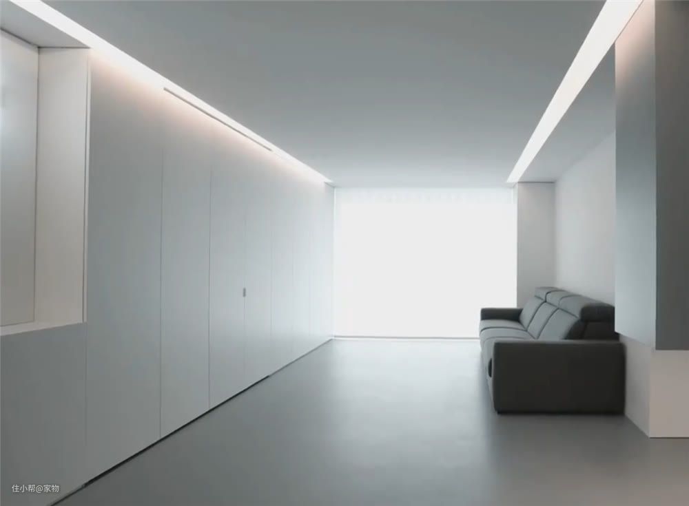 转过头来看看客厅,甚至电视也被藏在了柜内,不看的时候就将柜门关上,而沙发可能是为了点缀空间,并没有选择白色……