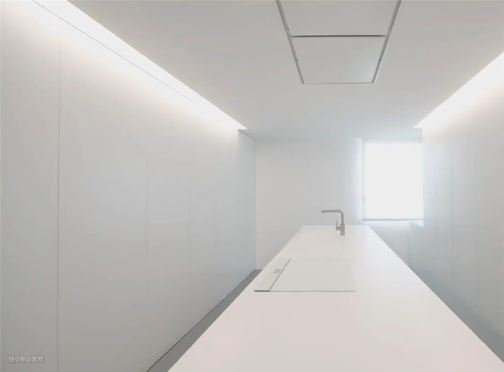 整间厨房中,除了中间岛台有一个水槽以外,基本上所有的地方都是纯平的表面,甚至就连头顶的天花板上,也被无主灯的设计“抹平”,没有丝毫杂乱的感觉。