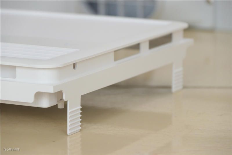 我们从侧面看,可以看到发光面板是一个悬浮设计的,侧面均设计了大面积的开孔,这其实是换气时的出风口。边框上面还设计了四个带有卡扣的支架。这其实是用来跟主机对插在一起的,高低可调。