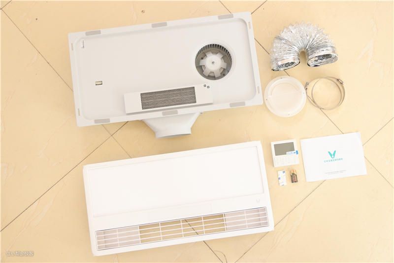 这就是全家福了,最大个的就是浴霸的本体,其实它的本体是分为两部分的,一部分为供暖模块,一部分为照明模块。两者相连接合并在一起,才能成为真正的浴霸了。其他配件包括:一根铝箔波纹管,一个单向阀,两个金属卡箍,一个面板遥控器,一幢3M双面胶贴,两节7号电视,再就是相关的说明书了,整体配件还是很全面的。