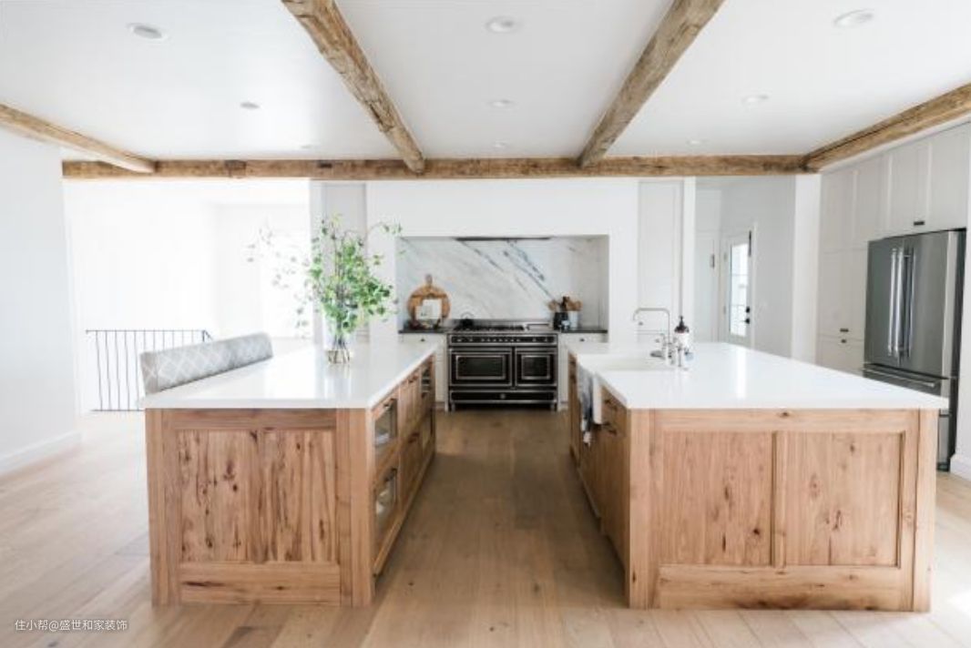 这个质朴的简约厨房展示了干净、整洁的设计如何有效地吸引人们对华丽的有机元素的注意,比如横跨天花板的手工凿成的外露横梁、形成两个巨大岛屿的多节松木板和排列在其范围后面壁龛的纹理大理石。天花板、墙壁、岛台面和橱柜的简单、闪闪发光的白色表面让这些天然材料的细节成为焦点。