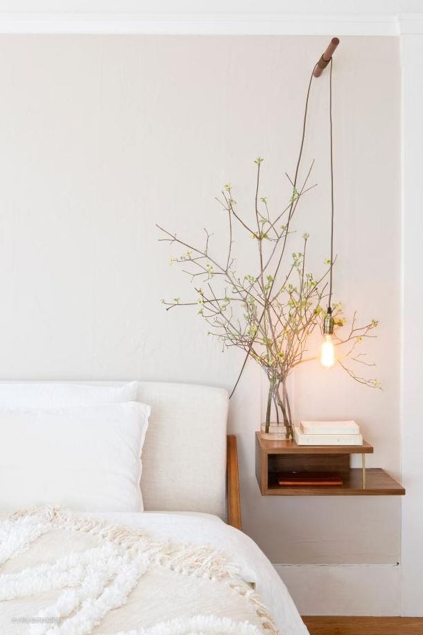 设计专家喜欢讨论动态颜色和图案如何鼓励观众将目光从一个特征转移到另一个特征:眼睛应该移动,对吗?极简主义空间有相反的目标:这间卧室旨在让人感觉宁静而不是刺激。白色亚麻布与干净的白色墙壁和地板相得益彰,一个简单的浮动床头柜为玻璃花瓶和一些中性书籍提供了一个基本的栖息地。
