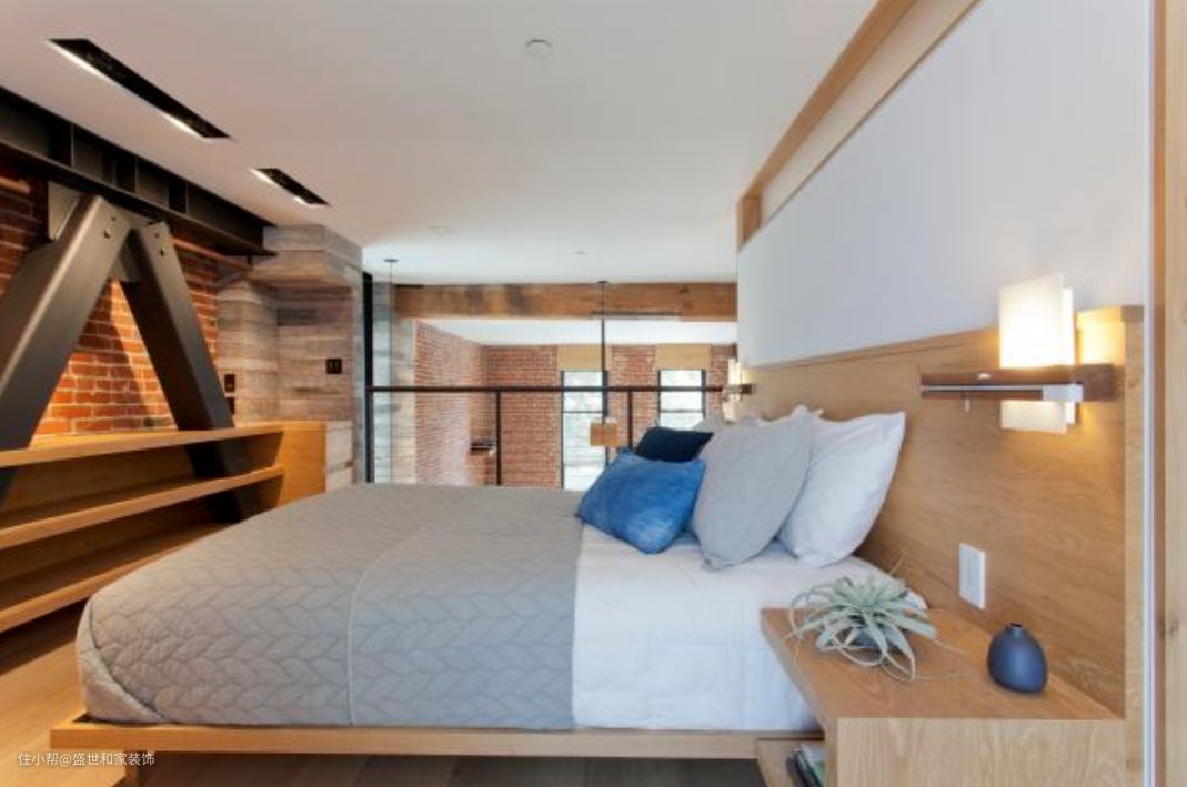 保持空间专注于干净的线条并尽量减少干扰的最简单方法之一当然是选择同时提供多种功能的集成家具。在这个极简主义阁楼的睡眠区,有角度的橡木平台床和浮动床头柜无缝地流入床头板,床头板兼作一对床头烛台的支架。在空间的后墙上,由相同橡木制成的内置搁板终止于没有硬件的光滑梳妆台。房间的建筑材料本身——即裸露的砖、氧化钢梁和未加工的混凝土板——是它唯一的装饰。