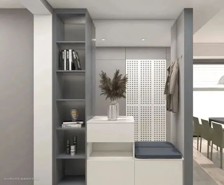 玄关柜不做到顶,中间镂空的阶梯式设计与错落有致的隔板架相融合,打破了空间的单调感又兼顾了展示功能,让整体的层次更丰富。
