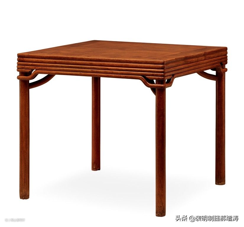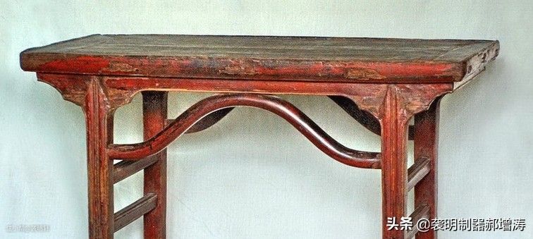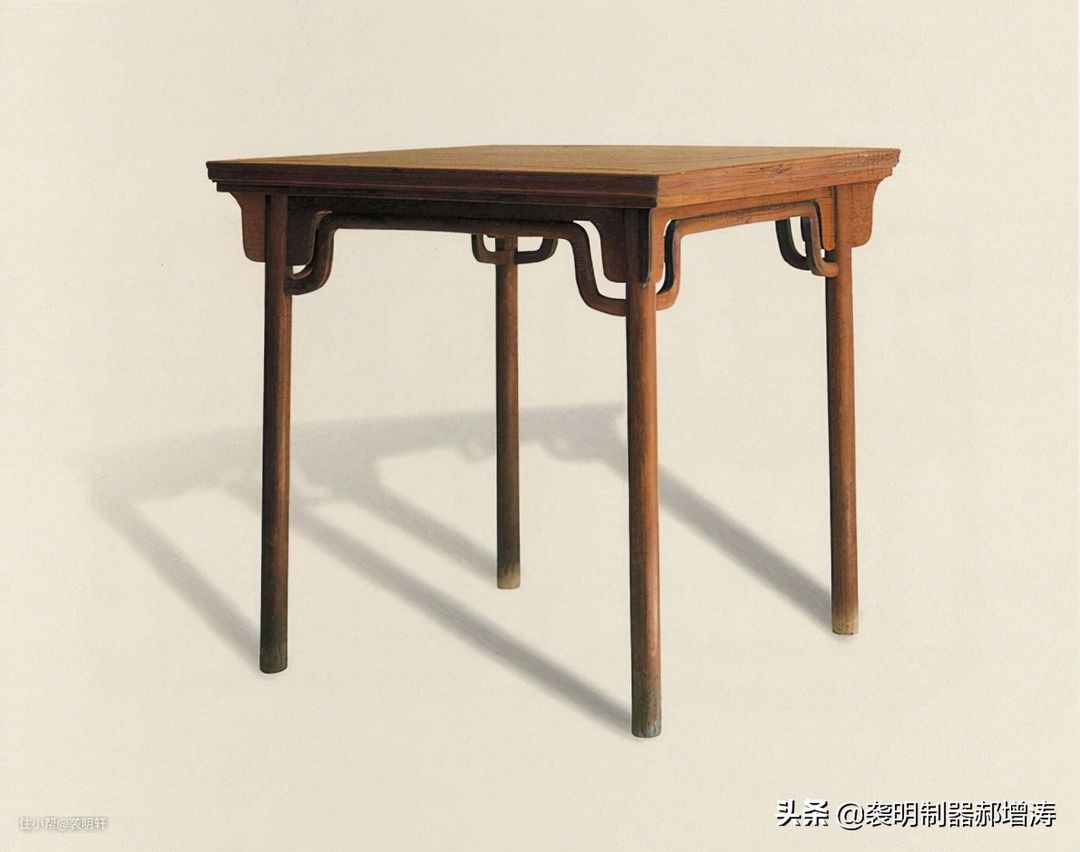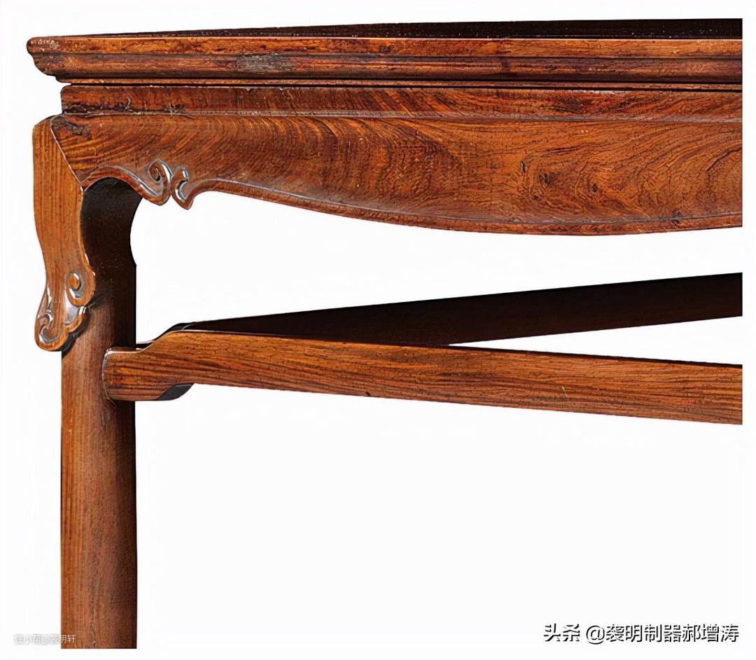 一腿三牙式的方桌常见顶牙罗锅枨。高拱罗锅枨也有弊端,弧度过高在拐弯的位置上遇到木材的横茬,容易开裂。