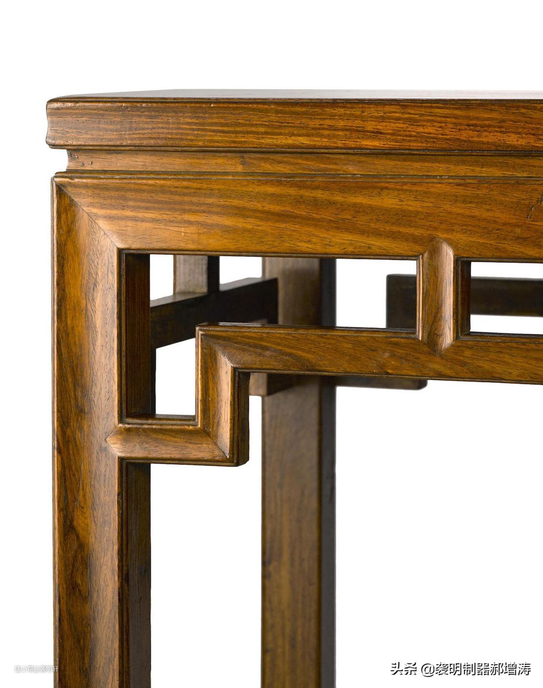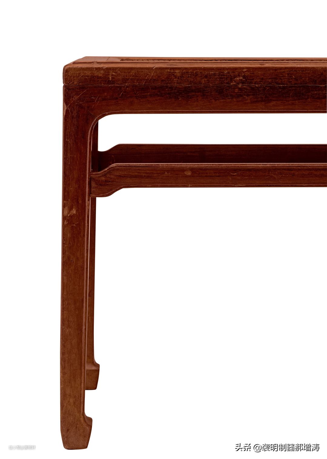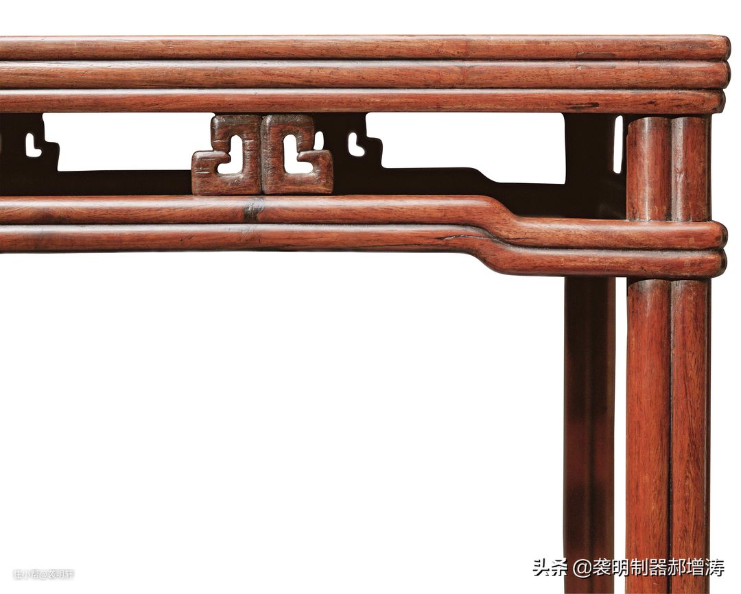 这桌子看上去层层叠叠的,从上到下依次是:边抹、垛边、顶牙罗锅枨。边抹和垛边用了劈料的线脚。