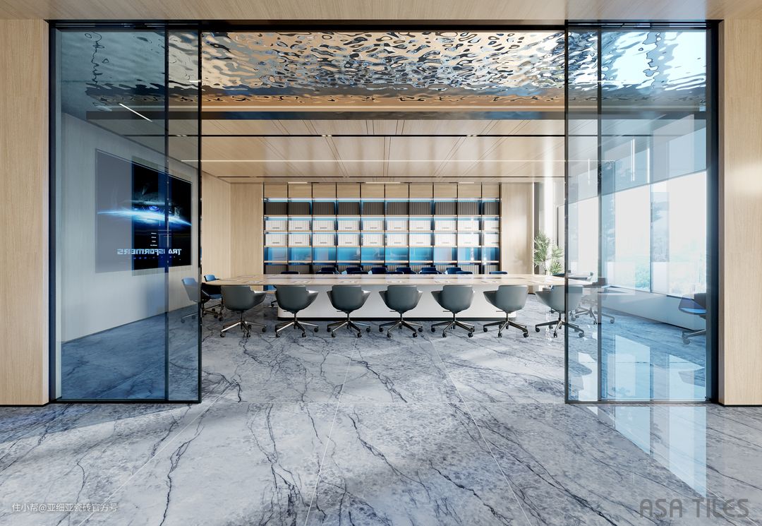 蓝黛冰川和宝格丽蓝相比色调更浅,整体看起来像一幅水墨画般风雅脱俗。极浅的蓝色瓷砖上延伸着一条条深色纹路。如果觉得作为地面颜色略浅,可像图片中一样作为较大面积的墙面背景。无论在商务环境还是在现代简约感十足的居家环境,透露出端庄大气的风格和淡妆素裹的文化底蕴。