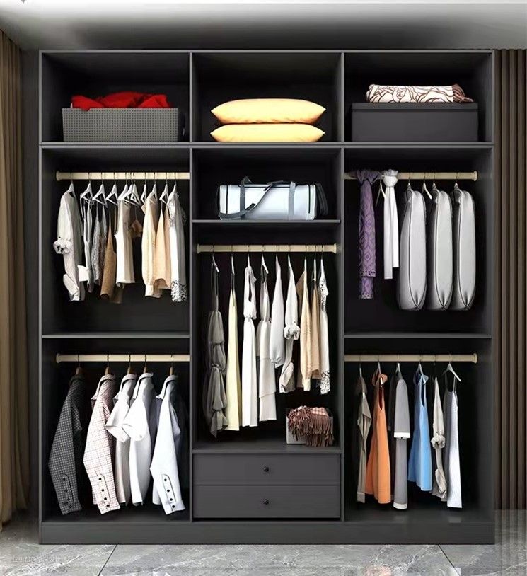 衣柜的设计要根据自己平时的生活习惯来划分。像我这样的懒人就喜欢悬挂区多一点,衣服方便拿取也方便挑选,女生包包和帽子多的可以多设置几个隔板用来收纳,如果经常出差的要留出一个专门放行李箱的地方。