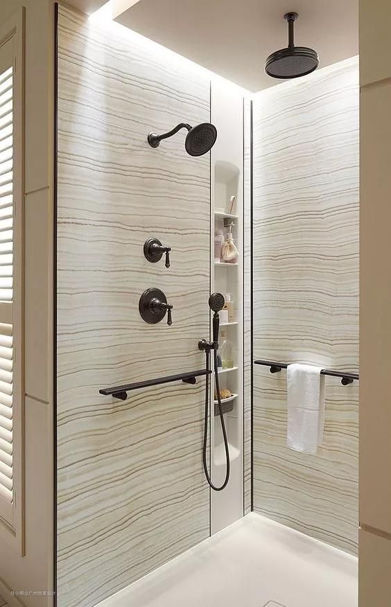 卫生间洗手台的位置和淋浴区都会有下水管道,在砌砖包水管道后,为了整体墙面的平整和美观,一般会选择把周围一起砌平。而壁龛的设计就是利用 “填补”的方法,美化下水管道和打造出一个收纳的空间。