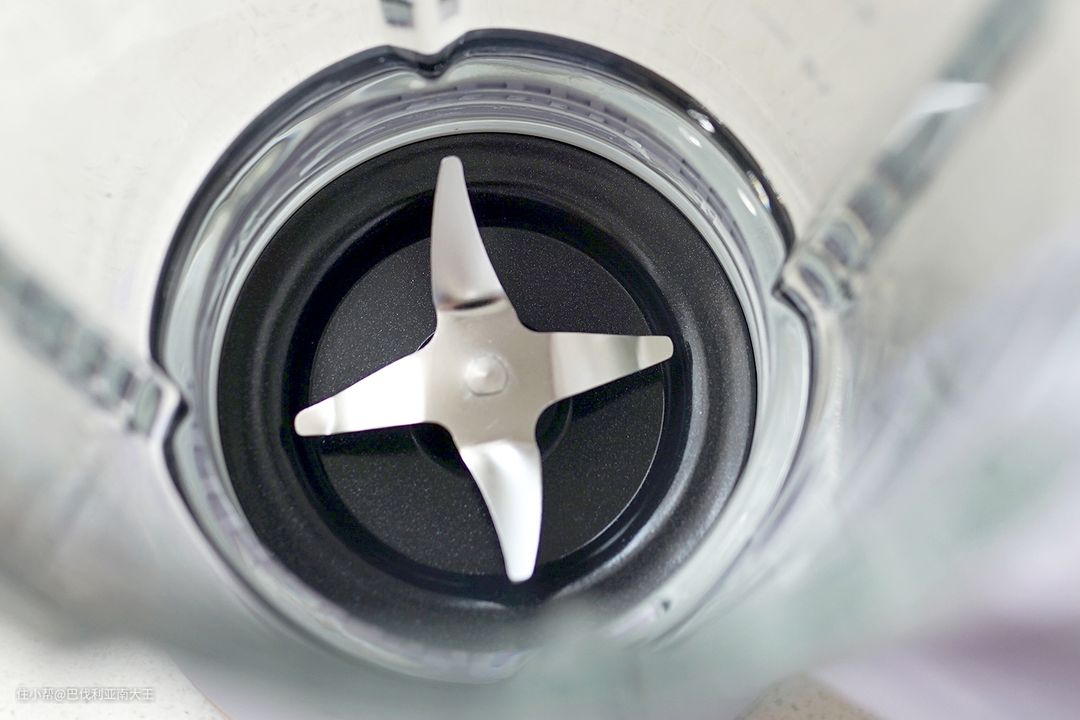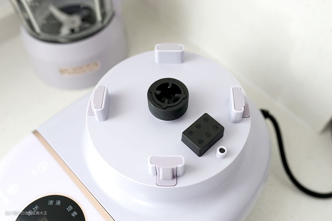 它是在电机和风道结构上做了改良,把搅拌杯拿下来,可以看到底座中间以及外侧的四根固定柱,都包裹着厚厚的缓震橡胶,提升稳固性的同时也能减弱噪音。再加上铜制电机的升级,整体分贝就大大降低了。