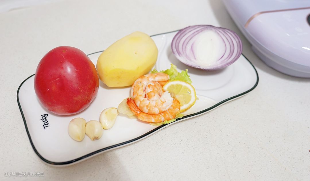 所需食材:番茄1个、土豆1个、洋葱1/3颗、黄油15g、蒜头3粒、虾若干