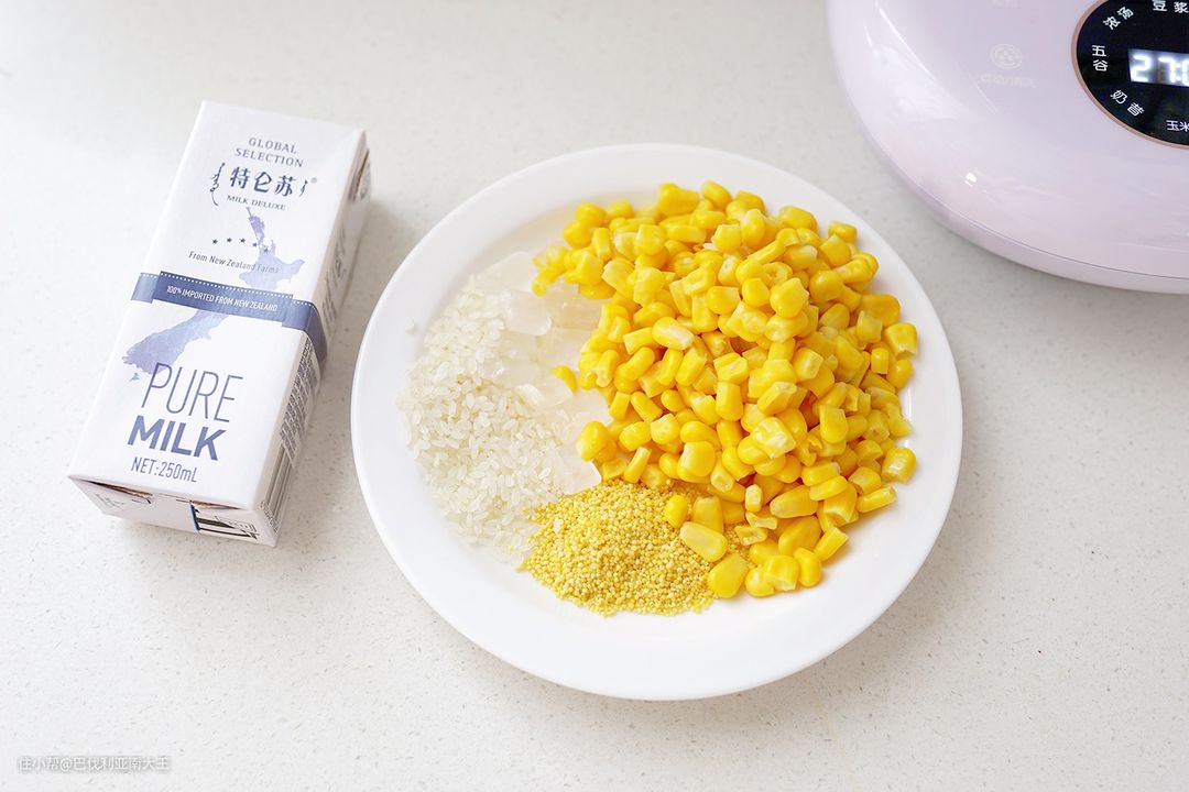 所需食材:玉米粒150g、冰糖30g、大米20g、小米10g、纯净水450g、牛奶300ml