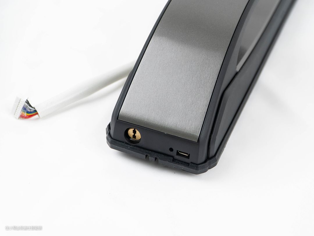 当然,作为一个门锁产品,它还是支持传统机械钥匙开锁的,在把手底部,可以看到机械钥匙插孔,旁边的micro-USB接口是应急供电口,如果当门锁电池电量不足的时候,在门外也可以使用移动电源供电。