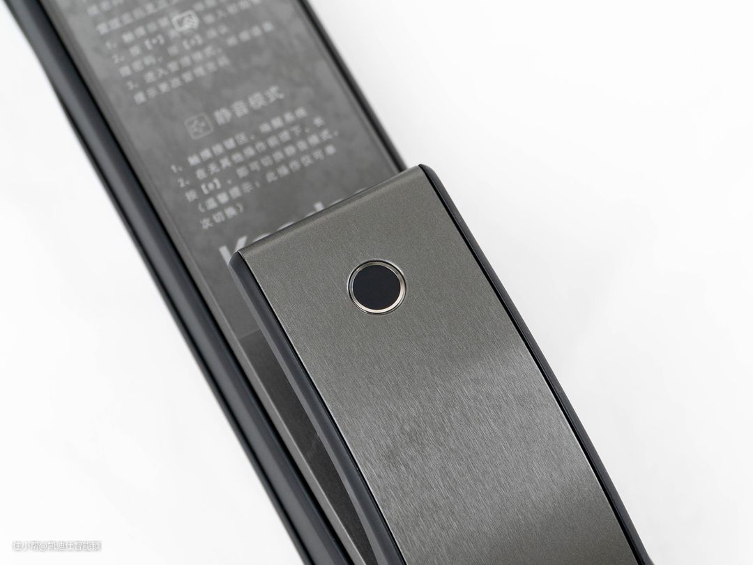 内外把手几乎是对称式的设计,在外把手上,可以看到有一个圆形的指纹键,指纹传感器采用瑞典FPC半导体传感器,识别速度还是非常快速准确的。上方平面的位置是隐藏的密码锁位置以及NFC刷卡区域。