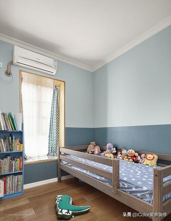 让两种颜色在墙上“平分秋色”,可以把深色和浅色同时带入室内,颜色占用的比例可以根据情况而有所变化。比方说儿童房,不想搞得太复杂,可以采用双色墙的方式,丰富空间色彩增加趣味性。